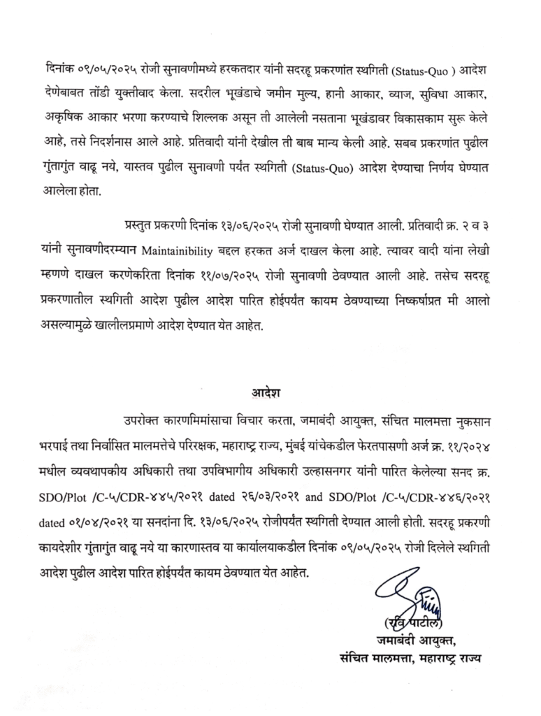 рдЙрд▓реНрд╣рд╛рд╕рдирдЧрд░ рдХреЗ рдмрд╣реБрдЪрд░реНрдЪрд┐рдд рднреВрдЦрдВрдб рд╡рд┐рд╡рд╛рдж рдореЗрдВ рдорд╣рд╛рд░рд╛рд╖реНрдЯреНрд░ рд░рд╛рдЬреНрдп рдХреЗ рдЬрдорд╛рдмрдВрджреА рдЖрдпреБрдХреНрдд рдПрд╡рдВ рд╕рдВрдЪрд┐рдд рдорд╛рд▓рдорддреНрддрд╛, рдиреБрдХрд╕рд╛рди рднрд░рдкрд╛рдИ рддрдерд╛ рдирд┐рд░реНрд╡рд╛рд╕рд┐рдд рдорд╛рд▓рдорддреНрддреЗрдЪреЗ рдкрд░рд┐рд░рдХреНрд╖рдХ рдиреЗ рдмрдбрд╝рд╛ рдлреИрд╕рд▓рд╛ рд╕реБрдирд╛рдпрд╛ рд╣реИред рд╡рд┐рд╡рд╛рджрд┐рдд рдкреНрд▓реЙрдЯ рдкрд░ 09 рдордИ 2025 рд╕реЗ рд▓рд╛рдЧреВ Status-Quo рдЖрджреЗрд╢ рдХреЛ рдЕрдирд┐рд╢реНрдЪрд┐рддрдХрд╛рд▓ рдХреЗ рд▓рд┐рдП рдмрдврд╝рд╛ рджрд┐рдпрд╛ рдЧрдпрд╛ рд╣реИред рдЗрд╕рдХрд╛ рдорддрд▓рдм рд╣реИ рдХрд┐ рдЕрдм рдЗрд╕ рднреВрдЦрдВрдб рдкрд░ рдХреЛрдИ рднреА рдирд┐рд░реНрдорд╛рдг рдХрд╛рд░реНрдп, рдмрд┐рдХреНрд░реА, рд╣рд╕реНрддрд╛рдВрддрд░рдг рдпрд╛ рдХреЛрдИ рдЕрдиреНрдп рдмрджрд▓рд╛рд╡ рдкреВрд░реА рддрд░рд╣ рдкреНрд░рддрд┐рдмрдВрдзрд┐рдд рд░рд╣реЗрдЧрд╛, рдЬрдм рддрдХ рдХреЛрд░реНрдЯ рдХрд╛ рдЕрдВрддрд┐рдо рдЖрджреЗрд╢ рди рдЖ рдЬрд╛рдП