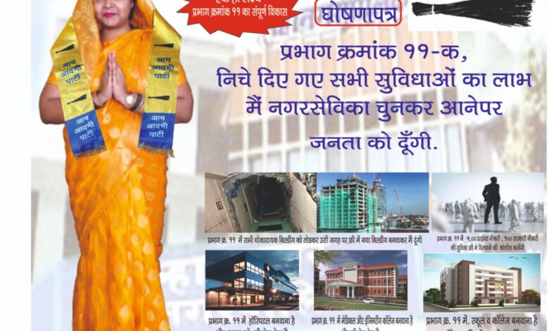 उल्हासनगर: महाराष्ट्र के आगामी महानगरपालिका चुनाव 2025-26 को लेकर राजनीतिक सरगर्मी तेज हो गई है। इसी क्रम में, आम आदमी पार्टी (AAP) ने प्रभाग क्रमांक 11(क) से अपनी शिक्षित और अधिकृत उम्मीदवार सौ. पूजा संतोष वाल्मिकी के पक्ष में एक व्यापक घोषणापत्र (Manifesto) जारी किया है। ‘झाड़ू’ निशान के साथ चुनावी मैदान में उतरीं पूजा वाल्मिकी ने क्षेत्र के सर्वांगीण विकास के लिए कई महत्वाकांक्षी वादों की झड़ी लगा दी है।