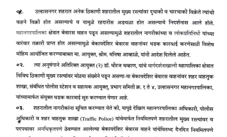 उल्हासनगर महानगरपालिका के कार्यक्षेत्र में मुख्य सड़कों पर बड़ी संख्या में अवैध एवं बेवारस वाहन खड़े होने से यातायात बाधित होने और नागरिकों को हो रही परेशानियों को गंभीरता से लेते हुए प्रशासन ने सख्त कार्रवाई का निर्णय लिया है।