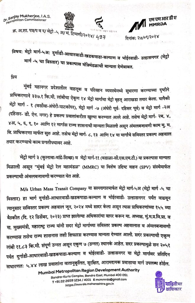 141 рдЙрд▓реНрд╣рд╛рд╕рдирдЧрд░ рд╡рд┐рдзрд╛рдирд╕рднрд╛ рдХреНрд╖реЗрддреНрд░ рдХреЗ рдЖрдорджрд╛рд░ рдХреБрдорд╛рд░ рдЖрдпрд▓рд╛рдиреА рджреНрд╡рд╛рд░рд╛ рдЙрд▓реНрд╣рд╛рд╕рдирдЧрд░ рддрдХ рдореЗрдЯреНрд░реЛ-5рдП рд╡рд┐рд╕реНрддрд╛рд░ рдХреЗ рд▓рд┐рдП рд░рд╛рдЬреНрдп рд╕рд░рдХрд╛рд░ рддрдерд╛ рдореБрдВрдмрдИ рдорд╣рд╛рдирдЧрд░ рдХреНрд╖реЗрддреНрд░ рд╡рд┐рдХрд╛рд╕ рдкреНрд░рд╛рдзрд┐рдХрд░рдг (MMRDA) рдХреЗ рд╕рдордХреНрд╖ рд▓рдЧрд╛рддрд╛рд░ рдХрд┐рдП рдЧрдП рдкреНрд░рдпрд╛рд╕ рдЕрдм рдкрд░рд┐рдгрд╛рдо рджреЗрдиреЗ рд▓рдЧреЗ рд╣реИрдВред рджреБрд░реНрдЧрд╛рдбрд╝реА рд╕реЗ рдЙрд▓реНрд╣рд╛рд╕рдирдЧрд░ рддрдХ рдореЗрдЯреНрд░реЛ-5рдП рдХреЗ рдкреНрд░рд╕реНрддрд╛рд╡рд┐рдд рд╡рд┐рд╕реНрддрд╛рд░ рдХреЛ рдЖрд╡рд╢реНрдпрдХ рд╕реНрддрд░ рдкрд░ рд╕реНрд╡реАрдХреГрддрд┐ рдкреНрд░рджрд╛рди рдХрд░ рджреА рдЧрдИ рд╣реИ рддрдерд╛ рдЕрдВрддрд┐рдо рдордВрдЬреВрд░реА рд╣реЗрддреБ рдкреНрд░рд╕реНрддрд╛рд╡ рд░рд╛рдЬреНрдп рд╕рд░рдХрд╛рд░ рдХреЛ рднреЗрдЬрд╛ рдЧрдпрд╛ рд╣реИред