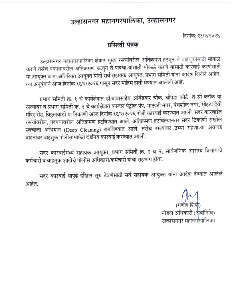 उल्हासनगर महानगरपालिका क्षेत्र में मुख्य सड़कों एवं फुटपाथों पर किए गए अतिक्रमण को हटाकर यातायात एवं पैदल यात्रियों के लिए मार्ग सुगम बनाने हेतु विशेष अभियान चलाया गया। माननीय आयुक्त तथा अतिरिक्त आयुक्त के निर्देशानुसार सभी सहायक आयुक्तों एवं प्रभाग समितियों को कार्रवाई के आदेश जारी किए गए थे। इसी क्रम में दिनांक 11/02/2026 से यह विशेष मुहिम शुरू की गई है।