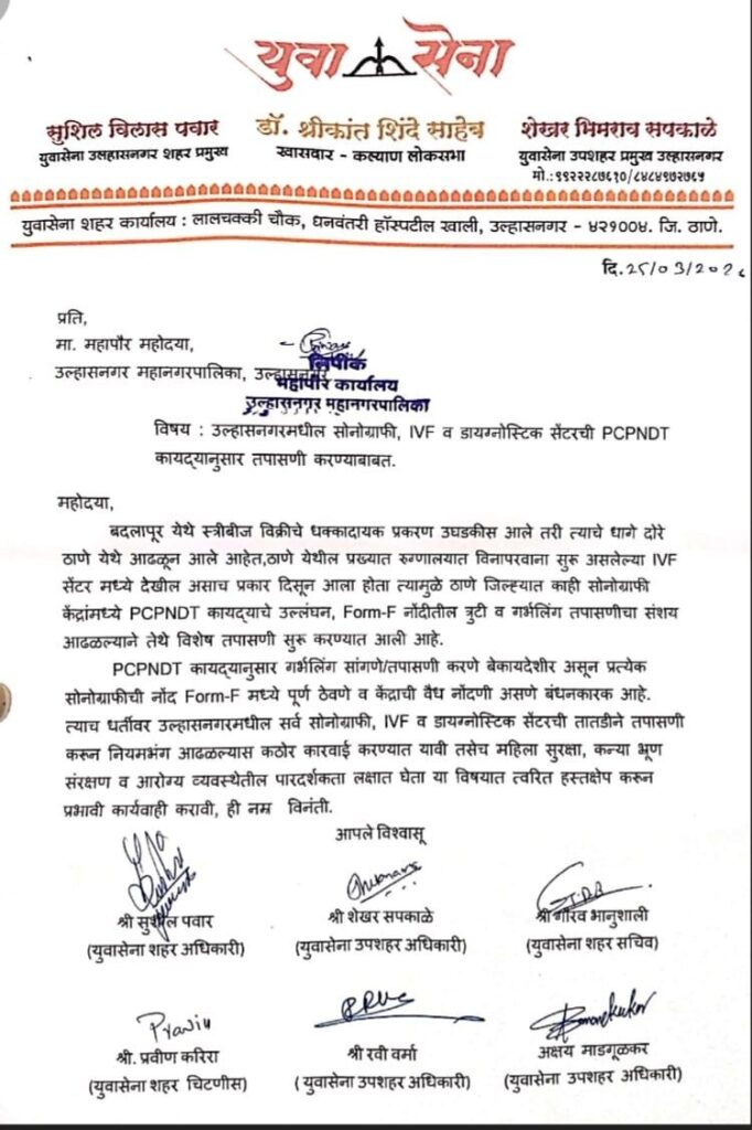 उल्हासनगर: ठाणे जिले में हाल ही में सामने आए ‘स्त्री-बीज’ (Egg Cell) बिक्री के चौंकाने वाले मामले और अवैध तरीके से चल रहे IVF केंद्रों के खुलासे के बाद अब युवासेना शहर प्रमुख सुशील पवार ने प्रशासन के खिलाफ मोर्चा खोल दिया है। उन्होंने उल्हासनगर महानगरपालिका की महापौर को पत्र लिखकर शहर के सभी डायग्नोस्टिक केंद्रों पर कड़ी कार्रवाई की मांग की है।