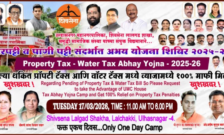 उल्हासनगर महानगरपालिका के सहयोग से शिवसेना लालगड शाखा, लालचक्की द्वारा नागरिकों की सुविधा के लिए प्रॉपर्टी टैक्स और पानी बिल से संबंधित “अभय योजना शिबीर” का आयोजन किया गया है। इस शिविर में उन नागरिकों को विशेष राहत दी जा रही है जिन्होंने अभी तक अपना प्रॉपर्टी टैक्स या पानी बिल जमा नहीं किया है।